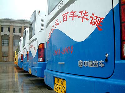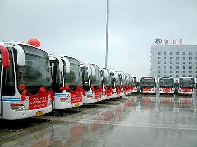 上午9點58分,天津大禮堂前廣場,具有象征意義的100臺嶄新的豪華公交大巴頭扎大紅花,整齊排列,活動氣氛莊嚴而隆重。