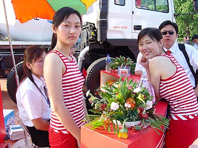 香車美女是每次車展的一大靚點(diǎn),本次車展也在例外,隨著上世紀(jì)90年代后期汽車展覽經(jīng)濟(jì)的興起,汽車模特租賃費(fèi)用也扶搖直上,據(jù)悉,不少模特早在一年前就和汽車廠家簽約。歷屆車展模特與其他產(chǎn)品模特沒有兩樣,主要是身材高挑、擺個(gè)姿勢、露臍罩胸、耍點(diǎn)風(fēng)騷。由于這些模特經(jīng)過專業(yè)禮儀訓(xùn)練,因而笑容呆板、動(dòng)作簡單、應(yīng)變能力差,對(duì)汽車知識(shí)知之甚少。針對(duì)一般模特存在的問題,安徽江淮客車有限公司獨(dú)樹一幟,加大校企聯(lián)系,從安徽大學(xué)(簡稱安大)02級(jí)生化系和03級(jí)外語系各聘來一位在校大學(xué)生幫助做好展會(huì)接待工作。