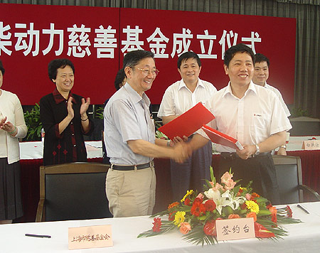 上海市慈善基金會副理事長袁采和上柴公司工會主席施一蒙分別代表上海市慈善基金會和上柴公司簽下了慈善合約。