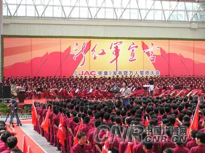 5月27日,安徽合肥國際會展中心,紅旗、紅裝匯成火紅的海洋,安徽江淮汽車集團公司在這里隆重舉行JAC憲章發(fā)布會暨萬人誓師大會,進一步激發(fā)了一萬多名員工新一輪的創(chuàng)業(yè)熱情,標(biāo)志著JAC的文化和戰(zhàn)略發(fā)展跨入歷史的新紀(jì)元,同時展示了這只在市場經(jīng)濟中拼搏的新紅軍隊伍學(xué)習(xí)創(chuàng)新的精神和魅力。