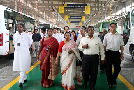 印度代表團(tuán)一行19人在宇通公司副董事長路法堯等公司領(lǐng)導(dǎo)的陪同下,參觀了工業(yè)園區(qū)和生產(chǎn)線,并在騰飛廣場參觀了展車。查特吉對宇通客車的內(nèi)飾、空調(diào)制冷情況、低地板公交技術(shù)等非常滿意,并不時豎起大拇指稱贊宇通客車非常豪華和精致。當(dāng)聽說宇通有國內(nèi)客車行業(yè)唯一的國家級技術(shù)中心和博士后科研工作站,擁有多項國內(nèi)甚至國際領(lǐng)先的技術(shù),能夠生產(chǎn)和歐洲同步的豪華客車,是中國出口客車最多的企業(yè)后,查特吉說,希望中國的企業(yè)能夠到印度開拓市場、尋求商機(jī),實現(xiàn)雙方的合作共贏。