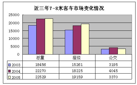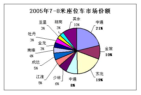 2005年7-8米客車銷售22592輛,略高于2004年,其中座位車銷量19159輛,占85%,比2004年略有增長(zhǎng);公交車銷量3370輛,占15%,比2004年有所下降。