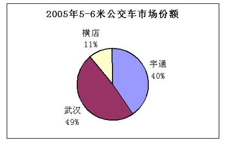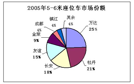 2005年5-6米客車銷售10762輛,比2004年減少了1/4,其中座位車占89.5%,公交車占10.5%。