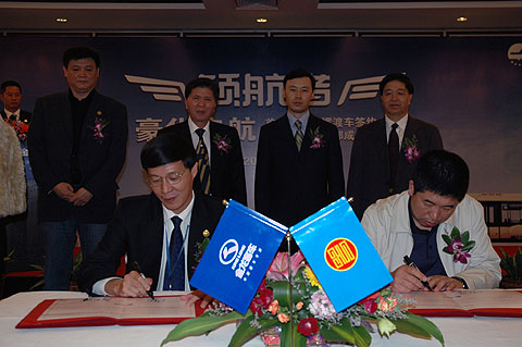 大金龍副總經(jīng)理陳志強和北京空港航空地面服務(wù)有限公司黑龍江分公司經(jīng)理劉利峰共同簽約