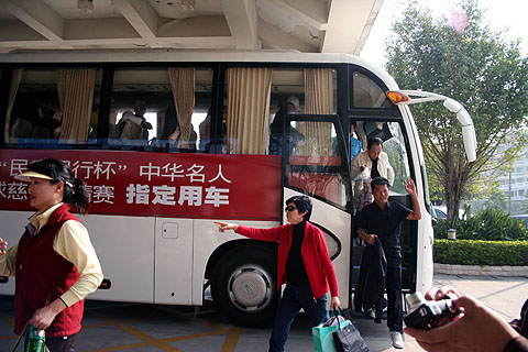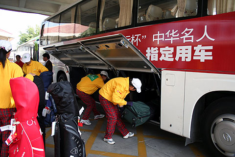 見慣了名牌轎車作為接送轉(zhuǎn)車的明星大腕們對集中乘坐大金龍豪華大巴參加比賽表現(xiàn)出新奇和興奮。記者注意到,在早上從酒店出發(fā)前往參賽地的途中,讀書、看報,有說有笑,興致都非常高,有的甚至還利用平穩(wěn)的車況和寬敞的車內(nèi)空間玩起了牌。而在比賽完的回程途中,除了部分精力充沛者仍在熱烈討論比賽情況以為,更多的明星則是選擇了打盹、睡覺。在鏖戰(zhàn)了數(shù)小時的高爾夫比賽后,車內(nèi)舒適、安靜的乘坐空間成為了眾明星睡覺補充體力的好地方。