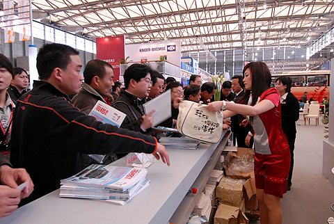 觀眾爭(zhēng)相領(lǐng)取海格客車雜志和海格環(huán)保袋