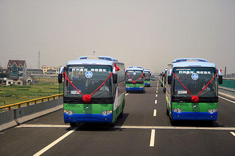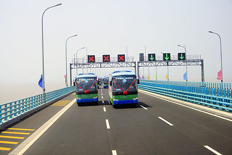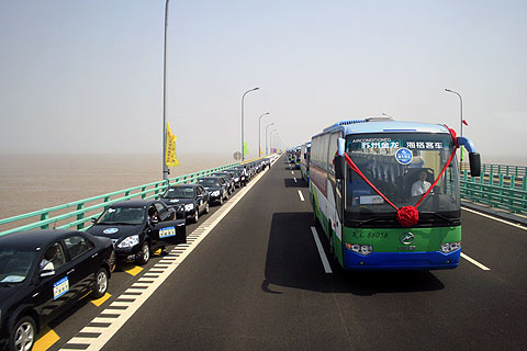 在斯堪尼亞·海格高檔豪華商務車的引領下,20多臺蘇州金龍海格客車組成的車隊浩浩蕩蕩跨過臥波巨龍,從嘉興駛向大橋對岸的寧波,演繹了一出“龍”跨“龍”的好戲,此舉標志著世界第一跨海大橋正式進入試運營階段。