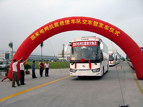 由四輛龍威客車組成的國家電網(wǎng)抗震救災(zāi)物資車隊(duì)出發(fā)