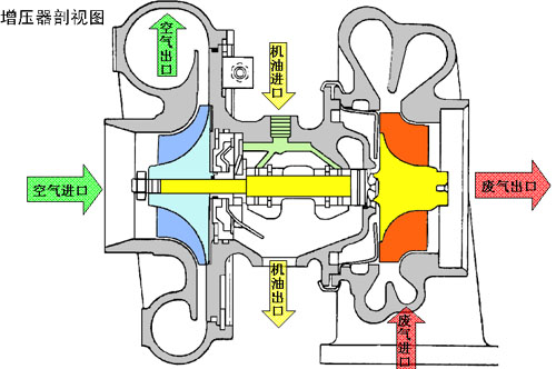 渦輪增壓器實際上是一種空氣壓縮機(jī),通過壓縮空氣來增加進(jìn)氣量。它是利用發(fā)動機(jī)排出的廢氣慣性沖力來推動渦輪室內(nèi)的渦輪,渦輪又帶動同軸的葉輪,葉輪壓送由空氣濾清器管道送來的空氣,使之增壓進(jìn)入汽缸。當(dāng)發(fā)動機(jī)轉(zhuǎn)速增快,廢氣排出速度與渦輪轉(zhuǎn)速也同步增快,葉輪就壓縮更多的空氣進(jìn)入汽缸,空氣的壓力和密度增大可以燃燒更多的燃料,相應(yīng)增加燃料量和調(diào)整一下發(fā)動機(jī)的轉(zhuǎn)速,就可以增加發(fā)動機(jī)的輸出功率了。