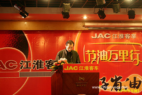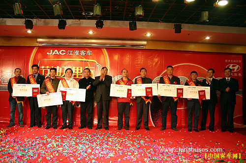 在節(jié)油總結表彰大會上,安徽江淮客車有限公司總經(jīng)理李永祥先生站在客車制造企業(yè)領導者的角度,闡述當前能源緊缺的現(xiàn)狀以及國家建設節(jié)能型社會的要求,他指出:"客車節(jié)油不能作為產(chǎn)品的賣點,不能把提供節(jié)油的產(chǎn)品僅僅作為企業(yè)的責任,而是應該把節(jié)能貫穿與產(chǎn)品的設計開發(fā)、生產(chǎn)制造乃至整個使用過程,把節(jié)油進行到底。"在接下來的頒獎儀式上,來自五省8個站點的10名獲獎選手代表拿到了江淮客車精心準備的獎品,媒體記者們紛紛按下快門,記錄下這美好的時刻。