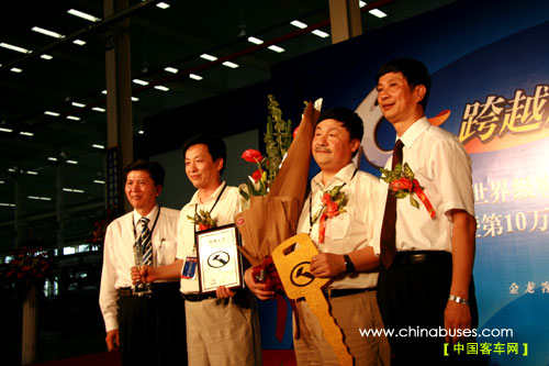 | 大金龍董事長孫建華先生和大金龍總經(jīng)理江世煌先生為第十萬輛客車擁有者頒發(fā)獎(jiǎng)狀并授金鑰匙 |