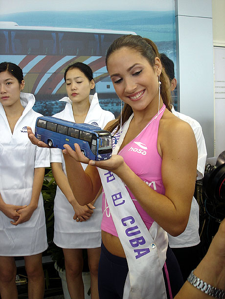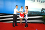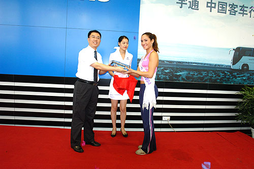 宇通公司副總經(jīng)理王文兵將宇通車模送給古巴國際旅游小姐