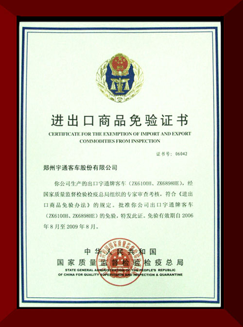 宇通獲得“進(jìn)出口商品免驗(yàn)證書”