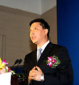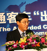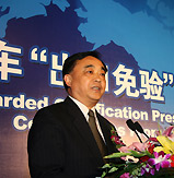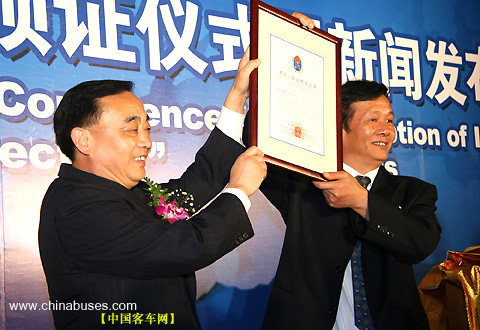 | 國家質(zhì)量監(jiān)督檢驗(yàn)檢疫總局副局長葛志榮鄭重地將一塊"金字招牌"--"進(jìn)出口商品免驗(yàn)證書",交到了鄭州宇通集團(tuán)總裁湯玉祥手上 |