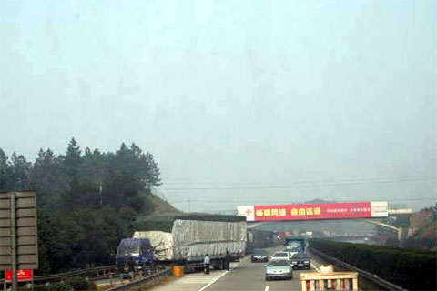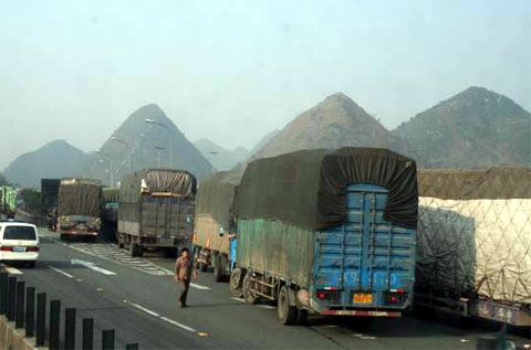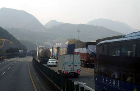 需要進入服務區(qū)加油的車輛在高速公路上無奈地等待著,與遠處的大山構成了一道獨特的風景,但是這種風景相信是所有人都不愿意看到的。