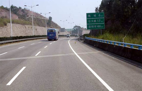 廣深高速去往深圳方向的左車道正在修路,一路上車流量很大,急著趕路的我們車速也提不上去。正在前方超車的肖師傅從倒車鏡里看到后面跟著的是一輛載有乘客的宇通客車,便把車從超車道駛?cè)胄熊嚨,讓他先過去。