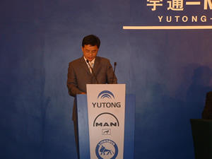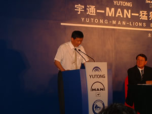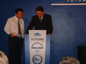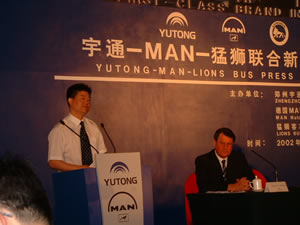2002年6月5日,宇通-MAN-猛獅聯(lián)合新聞發(fā)布會在第七屆北京國際汽車工業(yè)展覽會前舉行,鄭州市市長陳義初,宇通客車股份有限公司董事長、總經(jīng)理、黨組書記湯鈺祥,MAN商用車輛股份公司客車部總裁