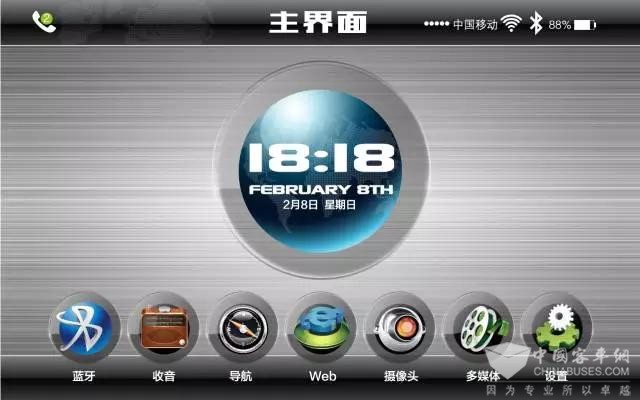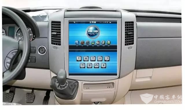 1;由上下兩塊屏幕組成,上屏實現(xiàn)娛樂視聽、監(jiān)控、導航、藍牙通信、網(wǎng)頁等功能;下屛實現(xiàn)控制燈光、空調(diào)、能量管理(包括電池、電機、SOC里程管理),并可拓展車隊管理、駕駛與控制(動力模式/省電模式)等功能。