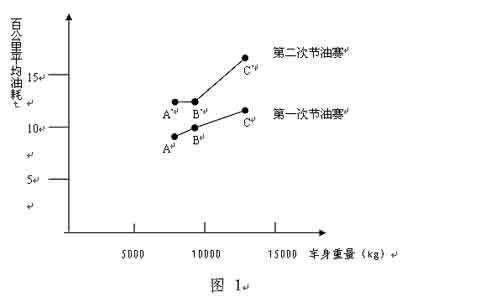 客車自重與油耗有著十分密切的關系,車身越重油耗越大,這是不爭的事實,因此,在保證安全和乘坐舒適的前提下,輕量化、緊湊化設計客車車身是各客車生產廠家追求的目標,事實也證明這一點。根據(jù)我集團公司兩次節(jié)油賽的油耗數(shù)據(jù)與參賽車輛自重的關系,繪出如下曲線圖。