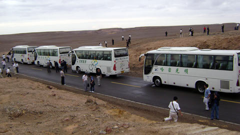 2008年8月28日,在簡單的出發(fā)儀式結束后,哈密光明旅游汽車公司的6臺金旅XML6896客車載著近200位中外客商,開始了穿越死亡之路——羅布泊的探險之旅。