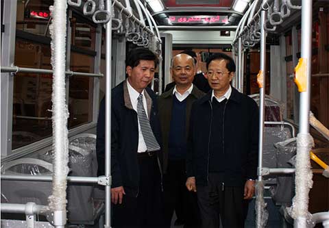 圖為陳清泰參觀大金龍出口伊朗18米BRT公交車