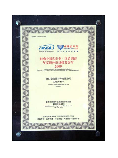 2008年12月21日,由中國(guó)道路運(yùn)輸協(xié)會(huì)道路運(yùn)輸裝備及安全節(jié)能工作委員會(huì)、客車網(wǎng)聯(lián)合舉辦的委員會(huì)年會(huì)暨道路運(yùn)輸、客車品牌、安全、節(jié)能論壇在云南昆明隆重舉行,并同期舉行“影響中國(guó)客車業(yè)·客車網(wǎng)讀者調(diào)查公布暨頒獎(jiǎng)典禮”。廈門金旅XML6103和XML6897兩款精品客車以其卓越的品質(zhì)、強(qiáng)大的品牌實(shí)力等分別榮獲“2009年度最受歡迎客車”以及“2009年度海外市場(chǎng)推薦車型”兩項(xiàng)殊榮。