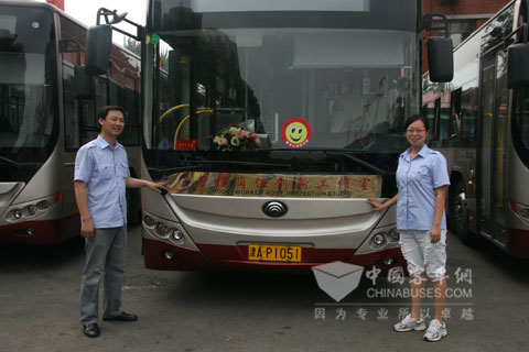 5路車隊勞動模范王欣與張美玲在宇通混合動力公交車前合影