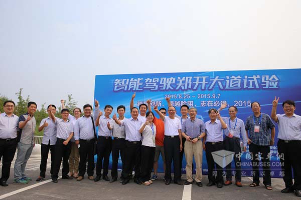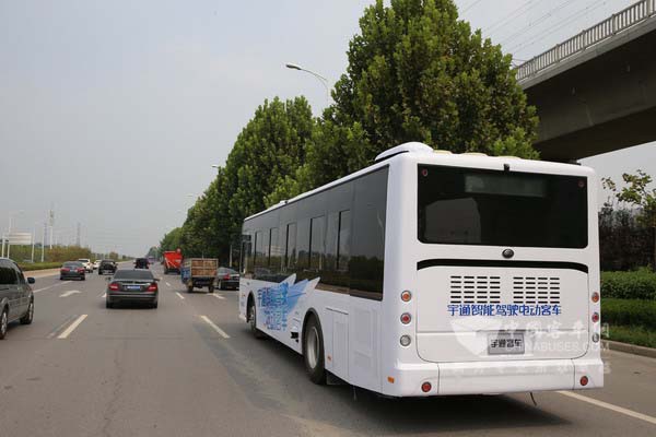 2015年8月29日,配置有2個攝像頭、4部激光雷達(dá)、1部毫米波雷達(dá)以及組合導(dǎo)航系統(tǒng)的宇通大型客車在全開放環(huán)境的鄭開大道上由西向東安全行駛了32.6公里,途徑26個信號燈路口,完成了跟車行駛、自主換道、鄰道超車、自動辨別紅綠燈通行、定點(diǎn)??康仍囼灴颇浚樌竭_(dá)測試終點(diǎn)。