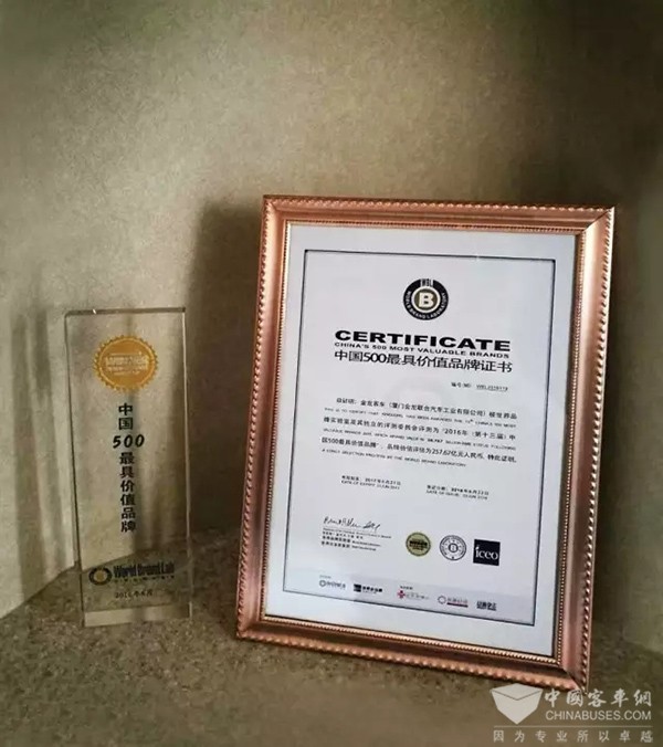 2016年6月22日,全球三大品牌價值評估機構(gòu)之一的世界品牌實驗室在京發(fā)布了2016年“中國500最具價值品牌排行榜”,金龍客車連續(xù)第十三年蟬聯(lián)榜單, 品牌價值再創(chuàng)新高,達257.67億元,相比2015年增長約20%,保持中國汽車工業(yè)前十強的地位。