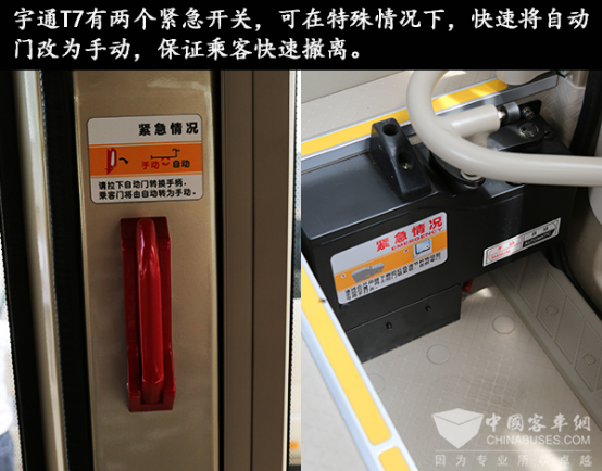 與其他競品車型形成鮮明對比的是,T7的排氣管收到了車身下且抬高了離地高度,這縮小了排氣管磕碰到異物的幾率。另外,T7在工作人員專座的上方有個拉手,遇到緊急情況時,可以將其拉開,車門便由自動切換為手動,能讓車內(nèi)人盡快撤離。