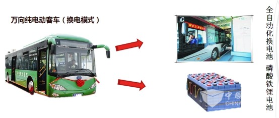 萬向純電動客車:杭州公交目前在用分兩批,第一批100輛采用換電模式,配備100KW交流電機,車輛的動力電池為磷酸鐵鋰電池,整車電池電壓576V,電池能量172千瓦/時,目前100輛換電模式純電動客車在3條線路上運營,一組電池平均可行駛里程100公里左右,換電模式具有換電時間快,但行駛里程短,營運成本高,在使用上有較大的局限性,目前共運行406萬公里。