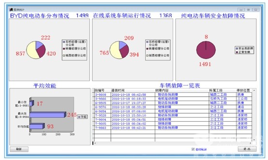 為了保障純電動客車安全運行,杭州公交集團(tuán)采用互聯(lián)網(wǎng)+的手段,構(gòu)建了新能源車后臺管理系統(tǒng),該系統(tǒng)實現(xiàn)了安全故障及時報警和相關(guān)數(shù)據(jù)有效上傳的功能,覆蓋了三個修理公司全部1500輛BYD純電動車。