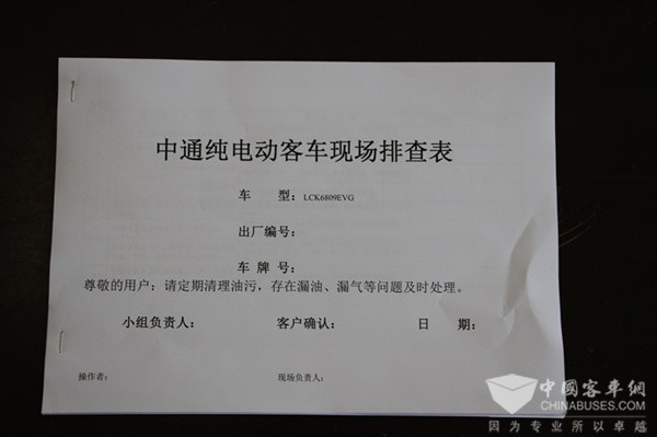在魯軍的講解中,我們了解到:中通“綠盾”行動會聯(lián)合電池、電機、電控三個主要品牌的廠家,并根據(jù)實際情況,選取各地服務站和其他零配件供應商,形成了“4+N”的立體排查體系。行動領導小組專門制定了《中通純電動客車排查作業(yè)指導書》和《中通純電動客車現(xiàn)場排查表》兩個指導操作文件,對排查工作進行了詳細的指示和分工。