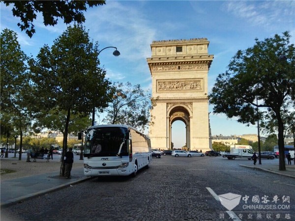 在法國巴黎街頭運(yùn)行的宇通客車