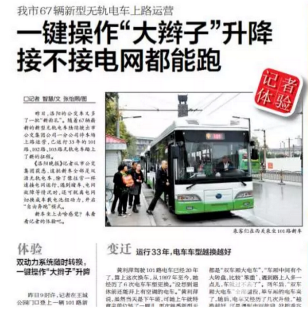 揚(yáng)子江新型雙源無(wú)軌電車駛進(jìn)洛陽(yáng)