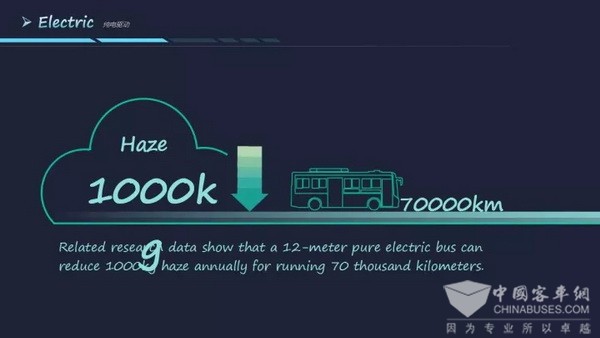據相關研究數據表明,1輛12米純電動公交年運行7萬公里,每年能夠減少1000kg的霧霾量。