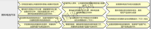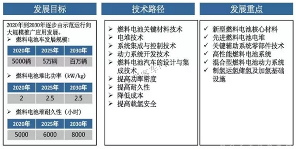 工業(yè)和信息化部、國家發(fā)展和改革委員會(huì)、科學(xué)技術(shù)部聯(lián)合印發(fā)《汽車產(chǎn)業(yè)中長期發(fā)展規(guī)劃》,燃料電池技術(shù)發(fā)展路線以2020年、2025年及2030年為三個(gè)關(guān)鍵時(shí)間節(jié)點(diǎn),依據(jù)產(chǎn)品研發(fā)-制造驗(yàn)證-批量應(yīng)用的規(guī)劃思路,使車用燃料電池電堆的性能、壽命、成本三個(gè)關(guān)鍵指標(biāo)依次達(dá)到商業(yè)化要求,并且完成電堆及關(guān)鍵材料的批量制造能力建設(shè),滿足燃料電池汽車發(fā)展需求。