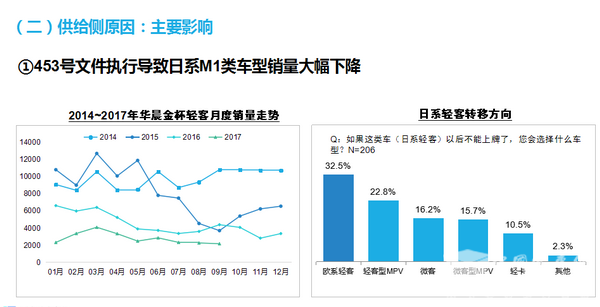 而供給側(cè)方面,主要受政策影響所致。首先,工信部453號(hào)文件執(zhí)行導(dǎo)致日系M1類車型銷量大幅下降。其次,新能源補(bǔ)貼政策變化頻繁,導(dǎo)致新能源輕客銷量大起大落。