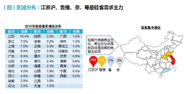 市場越是不好,競爭越是激烈。近些年,輕客企業(yè)市場表現(xiàn)明顯出現(xiàn)分化,可謂“幾家歡喜幾家愁”。其中,江鈴股份有限公司、北汽福田汽車股份有限公司近兩年銷量呈現(xiàn)持續(xù)增長態(tài)勢。江鈴股份有限公司則成了近兩年輕客市場的最大“歡喜者”,2015年輕客的銷量為63141輛,2016年的銷量為70072輛,同比增長19.9%,2017年1-9月份的銷量為54056輛,同比增長24.8%。此外,在產(chǎn)品格局方面,以江鈴全順、依維柯、上汽大通V80、江淮星銳、東風(fēng)御風(fēng)、奔馳凌特和福田圖雅諾等歐系輕客產(chǎn)品的占有率在繼續(xù)提升。燃油類型方面表現(xiàn)為柴油輕客份額上升,純電動(dòng)輕客起落明顯。2014年柴油輕客占比為58.6%,2015年柴油輕客占比為60.5%,2016年柴油輕客占比達(dá)69.4%,2017年1-9月柴油輕客占比竟高達(dá)74.0%。而純電動(dòng)輕客的占比并沒有出現(xiàn)持續(xù)增加,2014年純電動(dòng)輕客占比為1.4%,2015年純電動(dòng)輕客的占比為6.6%,2016年純電動(dòng)輕客的占比為3.8%,2017年1-9月純電動(dòng)輕客的占比僅為3.7%。 值得注意的是,輕客需求主要分布區(qū)域?yàn)榻K、浙江、上海、山東、河南、北京、廣東。輕客代表著商業(yè)文化,商業(yè)文化濃厚的區(qū)域是輕客銷售的主戰(zhàn)場。