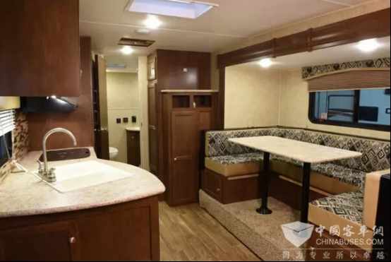 內(nèi)飾方面,中通逸居 LCK9030YKTV系列營(yíng)地拖掛房車家具采用防腐地板、耐磨地板革、生態(tài)環(huán)保板材打造,內(nèi)置雙人床、床頭柜、高檔 U 型皮革沙發(fā)(可轉(zhuǎn)變成床)、高檔酒柜、高檔影視墻、電視柜、32寸液晶電視、皮革吊頂。另外,廚房區(qū)配備的是一款 50L 冰箱。衛(wèi)生間為干濕分離式設(shè)計(jì),衛(wèi)生間配備了排風(fēng)扇、豪華洗手盆/冷暖雙水水龍頭、化妝鏡、電熱水器、高檔石英石臺(tái)面洗手池、化妝鏡、豪華淋浴間等設(shè)備等生活用具。具體車型可根據(jù)客戶需求進(jìn)行選裝,滿足各類客戶的定制化需求。