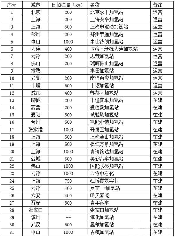 附表:國內(nèi)加氫站統(tǒng)計(jì)情況表