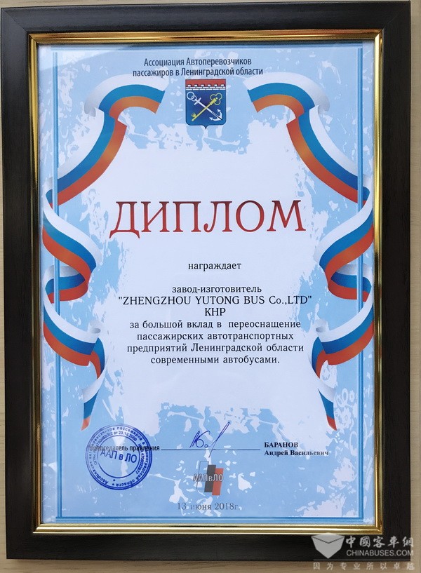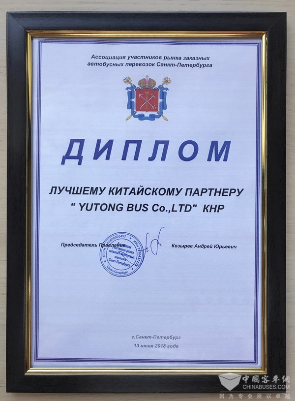 列寧格勒州運(yùn)輸協(xié)會(huì)授予宇通“最佳旅游巴士供應(yīng)商”