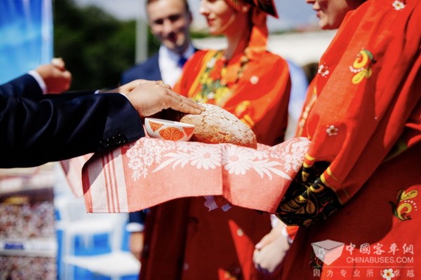 身著盛裝的俄羅斯女孩招待賓客鹽和面包  圣彼得堡運(yùn)輸協(xié)會(huì)授予宇通“最佳中國(guó)伙伴”榮譽(yù),列寧格勒州運(yùn)輸協(xié)會(huì)授予宇通“最佳旅游巴士供應(yīng)商”榮譽(yù),并期待雙方在交通運(yùn)輸領(lǐng)域有更深入的合作
