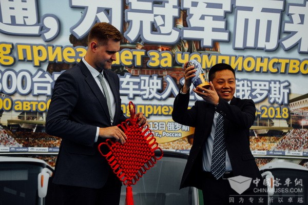 交車(chē)儀式上,身著民族盛裝的俄羅斯姑娘為來(lái)自中國(guó)的貴賓獻(xiàn)上代表待客最高禮遇的面包和鹽;中方代表則將象征友誼和智慧的中國(guó)結(jié)禮贈(zèng)俄方。圣彼得堡運(yùn)輸協(xié)會(huì)授予宇通“最佳中國(guó)伙伴”榮譽(yù),列寧格勒州運(yùn)輸協(xié)會(huì)授予宇通“最佳旅游巴士供應(yīng)商”榮譽(yù),并期待雙方在交通運(yùn)輸領(lǐng)域有更深入的合作。宇通客車(chē)、SpbTransBus企業(yè)負(fù)責(zé)人分別致辭,讓這份共贏的期盼,續(xù)奏雙方合作樂(lè)章。