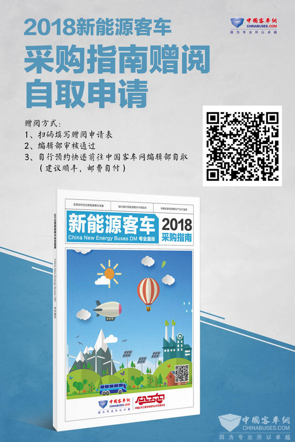 如果您或您公司有意申請贈閱《2018年度新能源客車采購指南》,請掃描文中圖片二維碼,填寫贈閱表單,編輯部審核通過后會與您取得聯(lián)系并安排郵寄刊物。如果您公司有意加入《2019年度新能源客車采購指南》,請聯(lián)系客車網(wǎng)《新能源采購指南》編輯委員會。