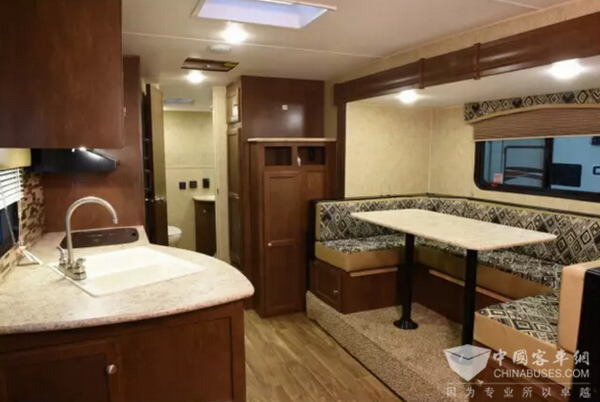 內(nèi)飾方面,中通逸居 LCK9030YKTV系列營地拖掛房車家具采用防腐地板、耐磨地板革、生態(tài)環(huán)保板材打造,內(nèi)置雙人床、床頭柜、高檔 U 型皮革沙發(fā)(可轉(zhuǎn)變成床)、高檔酒柜、高檔影視墻、電視柜、32寸液晶電視、皮革吊頂。另外,廚房區(qū)配備的是一款50L冰箱。衛(wèi)生間為干濕分離式設(shè)計(jì),衛(wèi)生間配備了排風(fēng)扇、豪華洗手盆/冷暖雙水水龍頭、化妝鏡、電熱水器、高檔石英石臺(tái)面洗手池、化妝鏡、豪華淋浴間等設(shè)備等生活用具。具體車型可根據(jù)客戶需求進(jìn)行選裝,滿足各類客戶的定制化需求。