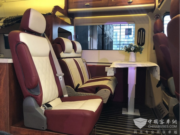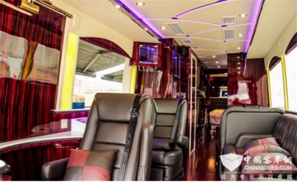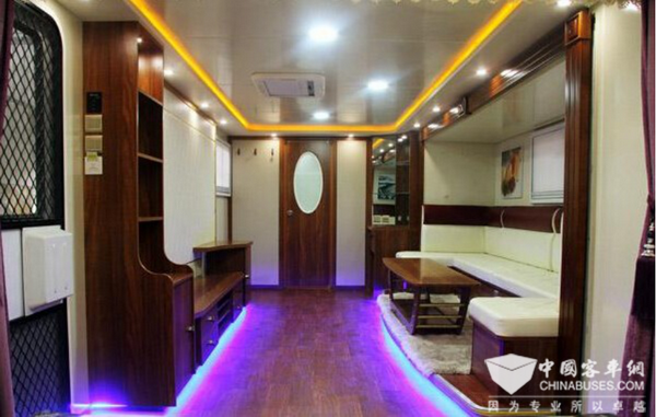 暗紅色的飾板和地板配以黑色的皮質(zhì)座椅,讓整個(gè)車內(nèi)的氛圍變得高檔起來;打開室內(nèi)全部燈光,給人的感覺像是星級(jí)酒店。360°可旋轉(zhuǎn)座椅搭配辦公臺(tái)面,辦公可以照常;工作之余吧臺(tái)來一杯紅酒體驗(yàn)美好生活,縱置沙發(fā)組合加上對(duì)坐沙發(fā),不管是會(huì)客還是開個(gè)party都綽綽有余。