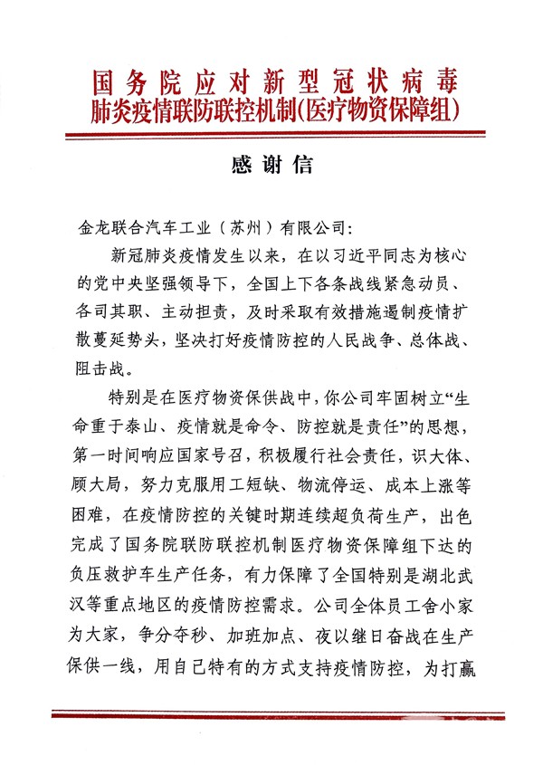2020年4月15日,在全國疫情防控形勢持續(xù)向好,生產(chǎn)生活秩序加快恢復(fù),統(tǒng)籌推進疫情防控和經(jīng)濟社會發(fā)展工作取得積極成效的當(dāng)下,蘇州金龍海格客車收到了來自國務(wù)院應(yīng)對新型冠狀病毒肺炎疫情聯(lián)防聯(lián)控機制(醫(yī)療物資保障組)的感謝信,對于在疫情防控的關(guān)鍵時期,蘇州金龍連續(xù)超負荷生產(chǎn),出色完成了國務(wù)院聯(lián)防聯(lián)控機制(醫(yī)療物資保障組)下達的負壓救護車生產(chǎn)任務(wù),有力保障了全國特別是湖北武漢等重點地區(qū)的疫情防控需求表達了誠摯的謝意,對于蘇州金龍為打贏疫情防控阻擊戰(zhàn)作出的突出貢獻表示認可和贊揚。