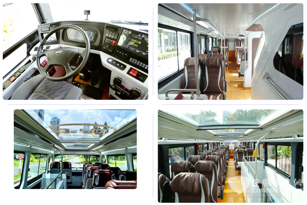 此外,為更好享受旅途風(fēng)光,車輛車身設(shè)計(jì)時(shí)就為窗戶預(yù)留出更大空間,輔以黑色窗框的精細(xì)拼合,提升整車透光度,更加寬敞明亮;二層的1.1米超級(jí)全景天窗,兩側(cè)視窗大面積分布,讓乘客觀光視野更開闊,坐在大巴車內(nèi)就可觀賞城市的大好風(fēng)光。同時(shí),車內(nèi)引入全息沉浸式投影技術(shù),搭載360度全景攝像、5G+VR等科技設(shè)備,提供中英日法等8種語言播報(bào),為各方來賓全面升級(jí)觀光體驗(yàn)。