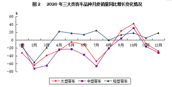 在客車主要品種中,大型和中型客車市場表現(xiàn)不如上年,銷量降幅比上年明顯擴大。分別銷售5.81萬輛和4.50萬輛,同比下降23.34%和32.04%,降幅比上年擴大18.91個百分點和20.46個百分點。輕型客車延續(xù)了上年小幅增長態(tài)勢,共銷售33.44萬輛,同比增長6.50%,增速比上年提升5.47個百分點。從三大類車型月度銷量同比增長情況來看,輕型客車自4月起需求呈快速增長,且4月-7月和10月以及12月同比增速均超過10%,表現(xiàn)明顯好于其他客車品種。